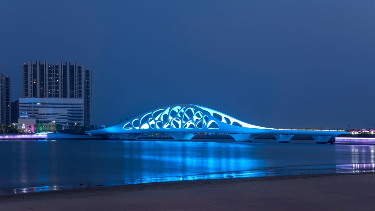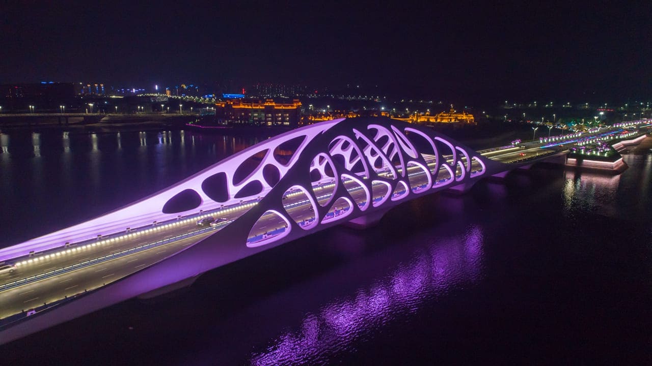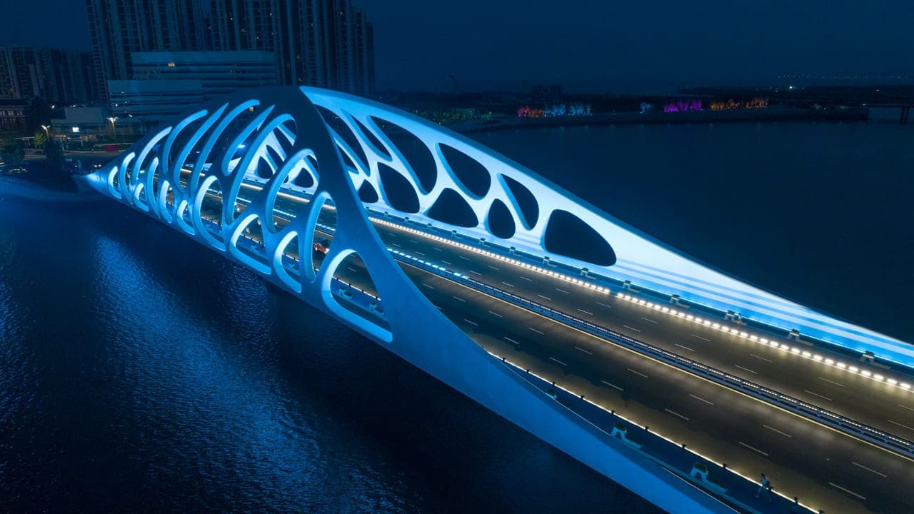 The bridge deck incorporates a three-dimensional curved coral-arch steel structure, reflecting the marine cultural characteristics of Qingdao. The design embodies the symbolic spirit of coral—representing auspiciousness, wisdom, safety, and beauty—into the image and character of the landscape bridge. The decorative arches resemble the curved shape of seashells, creating a "pearl-holding" posture. The hollowed texture of the bridge body is an artistic, simplified, and abstract outline of the coral's form. The overall design is sleek, fluid, and deeply meaningful, symbolizing a blooming "Coral Shell" on the West Coast.